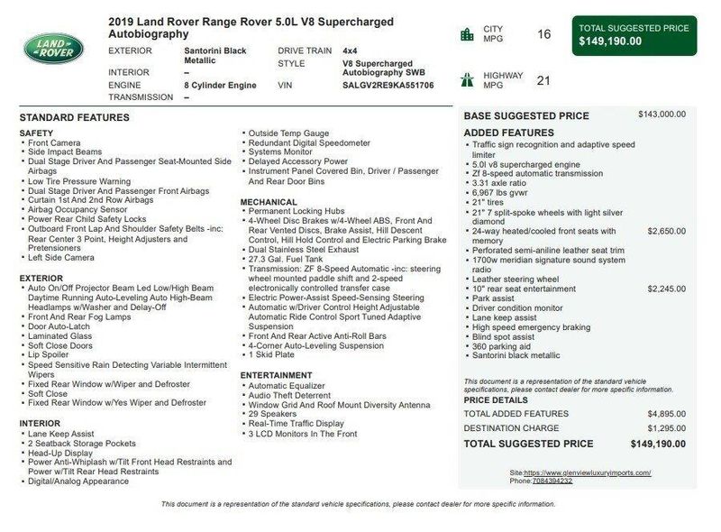 2019 Land Rover Range Rover 5.0L V8 Supercharged Autobiography 4WD 5.0L V8 Supercharged Santorini Black Metallic One Owner, Clean CARFAX, AWD, Navigation, Sunroof, Leather Seats, Heated Seats, Backup Camera, Memory Seats, Cooled Seats, Premium Sound System, Premium Audio, Multi-Zone Climate Control, Bluetooth, Hands-Free, USB Port, Portable Audio Connection, Apple CarPlay/Android Auto, Vintage Tan/Ebony/Vintage Tan/Ebony w/Perforated Semi-Aniline Leather Seat Trim, 10 Rear Seat Entertainment, 24-Way Heated & Cooled Front Bucket Seats, Driver Condition Monitor, Navigation system: Touch Pro Navigation System, Park Assist, Radio: 1700W Meridian Signature Sound System, Wheels: 21 7 Split-Spoke w/Light Silver Diamond. Recent Arrival!Awards:* ALG Residual Value Awards, Residual Value AwardsOur goal is to make your luxury and exotic car buying and owning experience unlike any other major purchase. With an unmatched attention to detail, truly impressive product lineup, and unique access to OEM parts. We are equipped to provide the ultimate in customer service every time you visit. In fact don?t think of us as a dealership at all. We?re your personal automotive concierge that offers the driving experience that your lifestyle demands. At our dealership, you?ll find a solid selection. If you have any questions for us, you can always get in touch at (847) 904-1233.